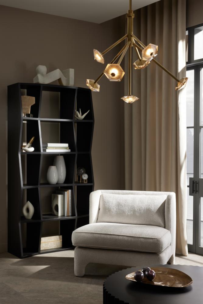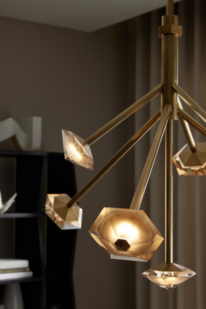 A celestial constellation of champagne colored crystal springs forth from a suspended iron structure finished in antique brass. Each flattened gemstone shape is illuminated by integrated LED. Both stellar and sophisticated, this elegant accessory was designed to illuminate every corner. Damp-rated, although limited covered outdoor conditions may affect finish.