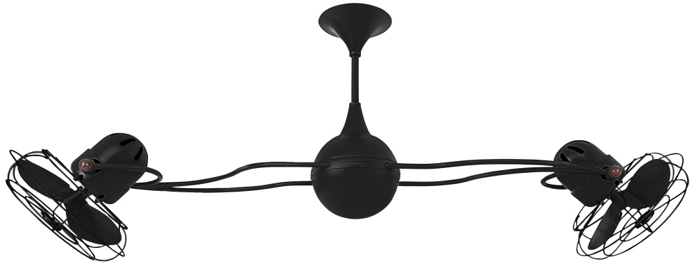 The Italo Ventania is the largest rotational fan in the Matthews Fan Co collection. Its vortex sculpted arms grasp also remarkable, side-mounted fan heads in gentle, equatorial rotation. The fan heads can be infinitely positioned in 180-degree arcs for optimum air movement; the greater the angle of the motor to the horizontal support rods (up or down), the faster the axial rotation. A slow, controlled axial rotation is achieved by both fan head position and fan blade speed.