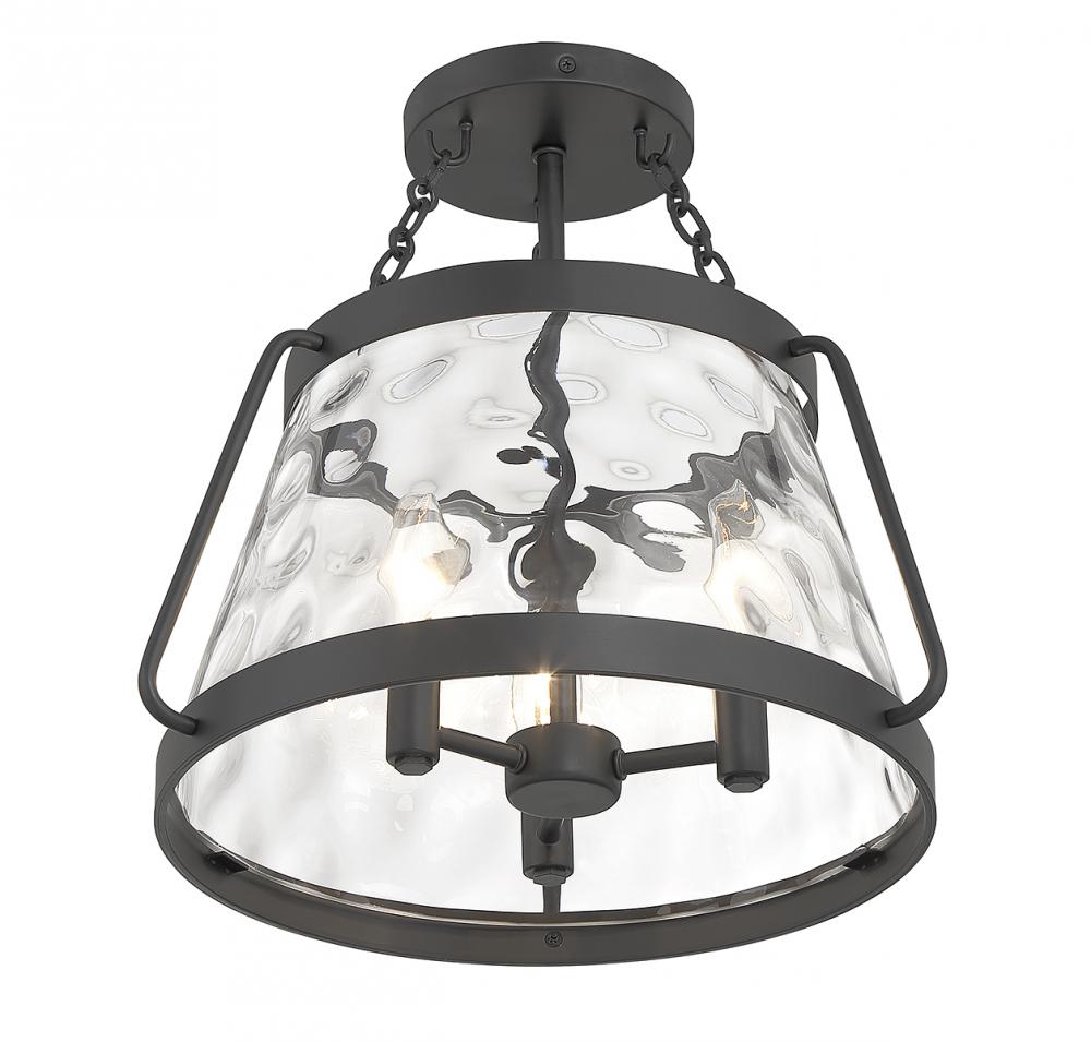 The Savoy House Crawford 3-light ceiling semi-flush mount proves that a classic style can be stunning! A lantern-inspired shade of clear water glass hangs down from an understated structure with industrial-inspired details. Finished in matte black. Crawford is 13.5” in height and 15” in width. It uses 3 candelabra size bulbs of up to 60 watts per bulb (bulbs not included).