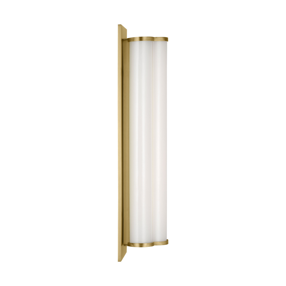 The Freya is a unique design by kate spade new york with three milk glass cylinders resting on a Burnished Brass back plate that can be placed vertically or horizontally. These wall lights are also technologically savvy, fitted with an integrated LED. With their sleek and chic design, the Freya vanity fixtures effortlessly complement any decor style, adding a dash of glamour to your dressing room, bathroom, or bedroom.
