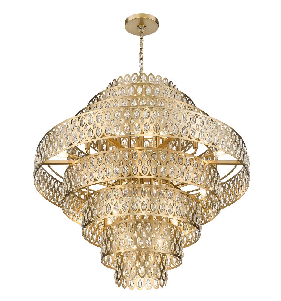 Sparkling crystals glitter within the eight tiers that create the impeccable silhouette of a modern glam 25-light pendant. Stunning over a staircase or in a gorgeous dining room, the pendant pairs glittering oval crystals with oval cutouts that decorate each of eight, heirloom brass finished drums that create a stunning layered effect thats sure to captivate.