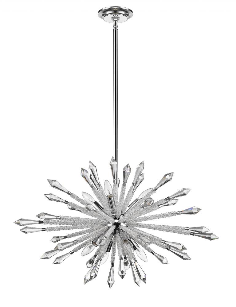 Gallery influence adds an artistic, detail-rich aesthetic to this chrome finish iron and crystal glass eight-light chandelier. Highlight a custom dining ensemble or entryway with a polished fixture emulating an energetic, explosive style.